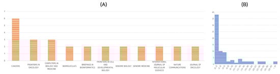 Our selected papers were published across a diverse range of academic journals, indicating the interdisciplinary interest in deep learning for cancer survival analysis using genomic data. The most frequent publication platform was “Cancers”, hosting six of the seventy-nine selected papers, a mere 8% of the total. Other common platforms included “Frontiers in Oncology” and “Computers in Biology and Medicine”, each with three papers. A detailed distribution of papers across different journals is shown in Figure 2A.