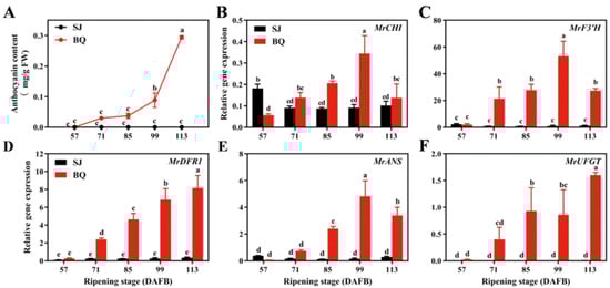 Anthocyanin content (A) and relative expression levels of MrCHI (B), MrF3′H (C), MrDFR (D), MrANS (E), and MrUFGT (F) involved in anthocyanin pathway in cvs. BQ and SJ during the ripening stage. Error bars represent the SE of the means from three biological replicates. Letters (a, b, c, d and e) indicate samples with statistically significant differences as determined by Duncan’s multiple range test (p < 0.05).