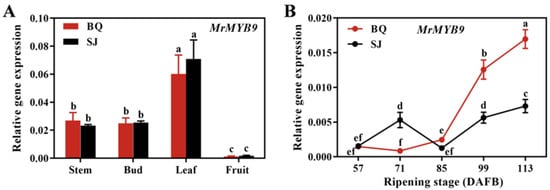Expression profiles of MrMYB9 in various tissues (A) and during fruit ripening (B) of cvs. SJ and BQ. Error bars represent the SE of the means from three biological replicates. Letters (a, b, c, d, e, and f) indicate samples with statistically significant differences as determined by Duncan’s multiple range test (p < 0.05).