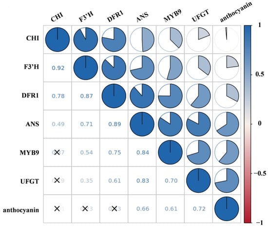 Analysis of correlations between MrMYB9, anthocyanin biosynthesis-related gene expression, and anthocyanin levels during the ripening of cvs. BQ fruits. Blue denotes a positive correlation, while red symbolizes a negative correlation. X denotes non-significant values (p > 0.05).