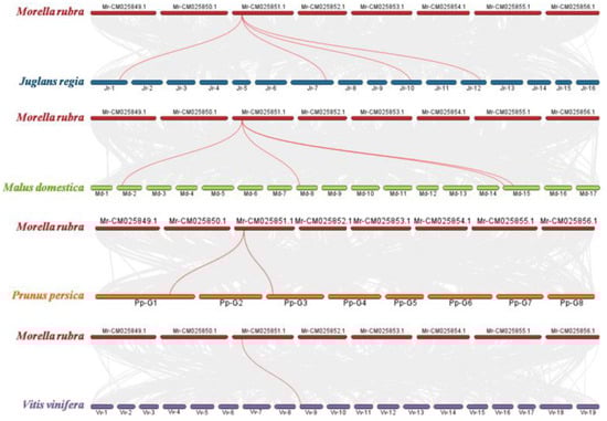 The evolutionary relationship between Morella rubra MrMYB9 and MYBs of other species, including Arabidopsis, walnut (Juglans regia), peach (Prunus persica), apple (Malus domestica), and grape (Vitis vinifera) was investigated using synteny analysis. The One Step MCScanX and DualSyntePlot programs were used to analyze the synteny relationship using TBtools [61].