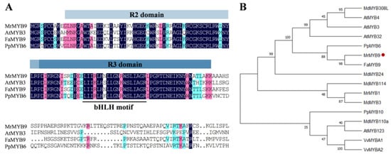 Protein sequence alignment (A) and phylogenetic tree (B) of MrMYB9 (red dot) and R2R3 MYB activators that modulate the synthesis of anthocyanin in other species. These are the GenBank accession: Fragaria ananasa FaMYB9 (OK001453); Prunus persica PpMYB6 (XM_007226528); Morella rubra MrMYB1 (GQ340767); Arabidopsis thaliana AtMYB3 (At1g22640), AtMYB4 (AT4G38620), AtMYB32 (AT4G34990), and AtMYB123 (AT5G35550); Vitis vinifera VvMYBA1 (BAD18977) and VvMYBA2 (BAD18978), and Malus domestica MdMYB3 (AEX08668), MdMYB23 (AAZ20439), MdMYB110a (BAM84362), and MdMYB308L (MDP0000950559).