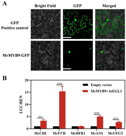 Subcellular localization (A) and regulatory effects (B) of MrMYB9 on promoters of anthocyanin biosynthesis-related genes in leaf epidermal tissue cells of Nicotiana benthamiana. The empty vector plus the promoter’s LUC/REN ratio was set to 1. Asterisks represent significant differences between the empty vector and MrMYB9 (** p < 0.01 and *** p < 0.001). Scale bar: 50 μm.