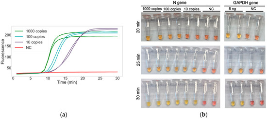 RT-LAMP sensitivity: (a) Amplification of two replicates of synthetic SARS-CoV-2 at 1000, 100, and 10 copies by fluorescent RT-LAMP; (b) Colorimetric RT-LAMP detection of 1000, 100 and 10 copies of synthetic SARS-CoV-2 (N gene) and 5 ng of human-extracted RNA (GAPDH gene) at 20, 25, and 30 min. NC: negative control, performed with water.