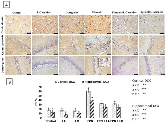 Figure 6. (A) Immunohistochemical staining of the cerebral cortex, CA region and dentate gyrus with DCX. Weak perinuclear membrane reaction was seen in control, L-arginine (LA) and L-carnitine (LC) groups. The Fipronil (FPN) group showed intense positive brownish immunoreactive neurons in the subgranular and granular cell layers. Reduced immunoreactivity of microglia in FPN + LA and FPN + LC-treated groups was seen (Anti-DCX 400×). (B) Immunoreactive parts percentage (IRP%) of DCX protein expressed as mean ± SE. Symbol a × b means a was statistically more varied than b; a × c means a was statistically more varied than c; and b × c means b was statistically more varied than c. Symbols **, *** indicate significant p values < 0.01 and 0.001, respectively.