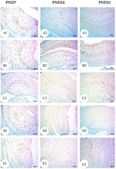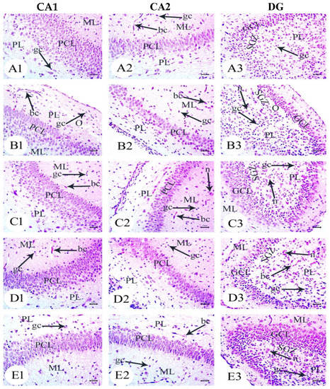 The hippocampus of offspring from rats that received saline injections had a normal histological structure across the testing period, as shown in Figure 3(A1–A3), Figure 4(A1–A3) and Figure 5(A1–A3). Typically, the dentate gyrus (DG) and cornu ammonis (CA) were visible. The CA comprised pyramidal cell, polymorphic, and molecular layers, which were rich in blood capillaries and glial cells. The four CA subfields (CA1, CA2, CA3, and CA4) were also present. CA1 contained 5–6 layers of small pyramidal cells with vesicular nuclei, whereas 3–4 pyramidal cell layers were found in CA2. Offspring from rats injected with saline also exhibited a typical DG composed of an upper layer of weakly stained granular cells with vesicular nuclei and a lower layer of immature granular cells situated in the subgranular zone. CA4 was found between the DG upper and lower limbs and also comprised molecular and polymorphic layers, of which the thickness increased from PND7 to PND21.