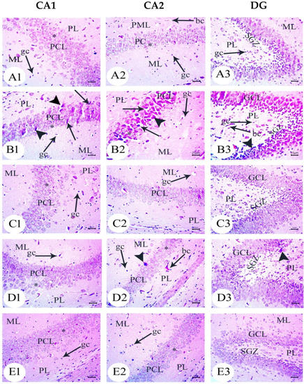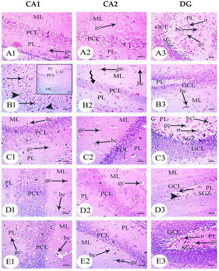 Photomicrographs of hematoxylin and eosin (H&E)-stained sections of neonatal hippocampus regions of CA1, CA2, and DG at PND14 of the following groups: (A) the saline-injected group which illustrated the normal organization of cells of the hippocampus with a normal histological structure of CA1 and CA2 of corniu ammonis that consisted of pyramidal cell layers (PCLs) containing normal pyramidal cells (PCs) with a vesicular nuclei and molecular layer (ML) and a polymorphic layer (PL), both of which were rich with blood capillaries (bc) with glial cells (gc). Dentate gryus (DG) showed a normal structure of granular cell layer (GCL) that contained closely packed granular cells with the normal subgranular zone (SGZ), in addition the ML and PL of DG, which contained normal glial cells (gc) with blood capillaries (bc). (B) In the Aβ 25–35-injected group, the CA1 and CA2 region showed that most of the cell bodies of the pyramidal neurons in PCL were disarranged and loosely packed; they appeared dark with pyknotic nuclei (arrow) and shrunken degenerated neurons with pericellular haloes (arrow head). ML and PL showed enlarged glial cells (gc) with pericellular haloes and dilated blood capillaries (bc). DG exhibited dark shrunken granule cell bodies having pyknotic nuclei (arrow head) with pericellular haloes (h). In the widening of SGZ, few immature neurons can be seen. (C) DMEM group showed normal histological structure of CA1, CA2, and DG regions of hippocampus. (D,E) AD treated with MSCs and AD treated with GSI-953, respectively; CA1 and CA2 region showed pyramidal cell bodies in PCL that appeared somewhat regularly arranged; a few of them were shrunken with pyknotic nuclei (arrow head) and the others were apparently normal (*). PL and ML displayed dilated blood capillaries (bc) and enlarged glial cells. DG displayed some apparently normal granule cell bodies (*), some of which appeared shrunken with pyknotic nuclei (arrowhead), and SGZ contained a considerable number of immature cells. ML and PL contained enlarged glial cells (gc) and dilated bc blood capillaries (bc). (scale bar = 25 µm). n = four animals for each group.