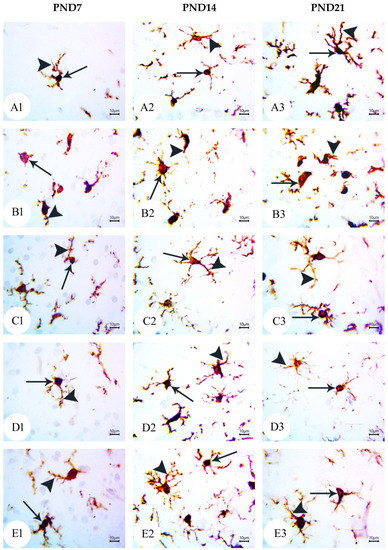 Hippocampus paraffin sections were cut at a thickness of 5 µm, blocked for one hour in a solution containing 1% bovine serum albumin (BSA) and 0.3% Triton X-100, and then incubated overnight at 4 °C with an antibody recognizing the microglial marker ionized calcium-binding adapter molecule-1 (Iba-1) from Abcam (Cambridge, UK). Afterwards, sections were exposed for one hour to a corresponding secondary antibody horse radish peroxidase (HRP). The immunostaining was visualized under a 10× and 100× objective lens on an Olympus microscope. Image J was used to quantify the number, size, and dimensions of the microglial cells (NIH, Bethesda, MD, USA).