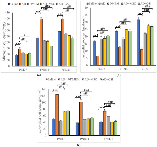 As a result of Aβ deposition, microglial cells become overly activated, which dramatically accelerates the progression of AD. Thus, we measured the number of activated microglial cells in the newborn hippocampal area (Figure 12, Figure 13 and Figure 14) using Iba-1 immunostaining. The number of microglial cells (Figure 14a) and the process length (Figure 14c) significantly (p < 0.001) increased in offspring from the saline-injected group (G1) from PND7 to PND21. Between PND7 and PND21, the offspring from the Aβ 25–35-injected group (G2) had significantly more Iba-1-positive cells, larger microglial soma, and a shorter process length (all p < 0.001) compared with those in age-matched G1 neonates (Figure 14a–c). According to qualitative histological analyses, BM-MSC and GSI-953 treatments significantly (p < 0.001) increased the processes length at PND7, PND14, and PND21 and restored the microglial number and soma size. Along with these main effects, the two-way ANOVA revealed a significant (p < 0.001) interaction between the therapy group and neonatal age, suggesting a return to normal hippocampal development.