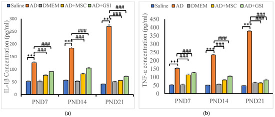 Effect of treatment with MSCs and GSI-953 on the concentration of neuroinflammatory cytokines (pg/mL): (a) IL-1β; and (b) TNF-α in newborns serum at different postnatal periods of Aβ 25–35-induced Alzheimer’s disease in dams. Data were analyzed by two-way ANOVA followed by Tukey’s multiple comparison test. Data are expressed as mean ± SEM, *** p < 0.001 vs. saline-injected group; ### p < 0.001 vs. AD group. n= six animals for each group.