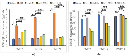 Effect of treatment with MSCs and GSI-953 on: (a) GSK-3β; and (b) BDNF concentration in newborns sera at PND7–PND21 of Aβ 25–35-induced Alzheimer’s disease in dams. Data were analyzed by two-way ANOVA followed by Tukey’s multiple comparison test. Data are expressed as mean ± SEM. *** p < 0.001 vs. saline-injected group. ### p < 0.001 vs. AD group. n = six animals for each group.
