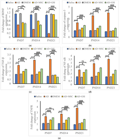 Effect of treatment with MSCs and GSI-953 on the gene expression of: (a) BDNF; (b) cleaved caspase-3; (c) TGFβ; (d) NFκB; and (e) TNFR in newborns’ hippocampus at different postnatal days of Aβ 25–35-induced Alzheimer’s disease in dams evaluated by qRT-PCR. Data were analyzed by two-way ANOVA followed by Tukey’s multiple comparison test. Data are expressed as mean ± SEM. *** p < 0.001 vs. saline-injected group. # p < 0.05; ### p < 0.001 vs. AD group. ns p >0.05 not significant. n = three animals for each group.