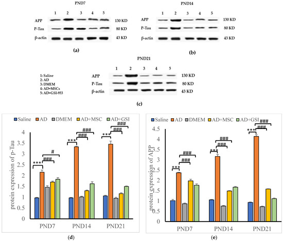 Tau phosphorylation is an essential pathogenic feature of AD and influences disease progression. BM-MSC and GSI-953 treatments significantly (p < 0.001) reduced tau phosphorylation in the hippocampus at all ages investigated compared with that in the offspring of G2 dams. However, we found a significant increase in phosphorylated tau protein in the hippocampus of offspring from G2 dams compared with that of G1 offspring (Figure 18a,b). The two-way ANOVA revealed that the treatment group’s main effect (p < 0.001) and the group x age interaction (p < 0.001) were significant. Similarly, the APP protein levels were significantly (p < 0.001) higher in the hippocampus of the G2 offspring compared with that in G1 offspring; however, the MSC and GSI-953 treatments significantly (p < 0.001) reversed this elevation (Figure 18a,b and Figure S1–S3) at all tested ages. Additionally, a significant main effect of the treatment group and a significant group × age interaction were found using two-way ANOVA (both p < 0.001).