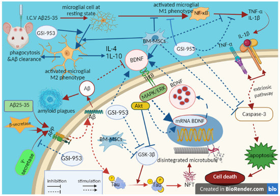 The cognitive deficits induced by the i.c.v. injections of Aβ 25–35 was improved by treating adult female rats with i.v. injections of BM-MSCs or the oral administration of the γ-secretase inhibitor GSI-953 (Begacestat). Additionally, prenatal BM-MSC and GSI-953 treatments protected against hippocampus maldevelopment in neonates. These protective effects in the neonatal rat hippocampus were linked to a reduced expression of APP and hyperphosphorylated tau protein, the suppression of microglial activation, the decreased expression of proinflammatory cytokines (IL-1β and TNF-α), and the down-regulation of brain levels of caspase-3, NF-κB, and TGF-β (Figure 13). Moreover, the down-regulation of BDNF expression and increased GSK-3β activity induced by Aβ 25–35 were reversed by BM-MSC and GSI-953 treatments. Therefore, these therapies seem to prevent Aβ 25–35-induced neurodegeneration and cognitive impairments by preventing the formation of Aβ plaque and NFTs as well as the resulting neuroinflammation. However, additional investigations are needed to determine the precise mechanism responsible for the anti-inflammatory effect of GSI-953 and BM-MSCs.