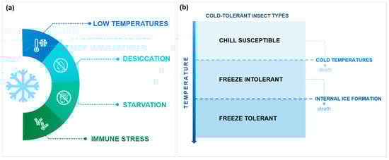 Temperature plays an important role in the overall biology of insects. As poikilothermic organisms, the insects’ body temperature depends on the environment, which affects the species’ behavior, distribution, development, and reproduction [,]. Due to climate change and global warming, extreme events such as droughts or heat waves are becoming more frequent. Even though an overall trend of winter warming is predicted, harsher winters with longer cold spells are still expected in some regions [,]. During the winter, insects face specific abiotic and biotic challenges (Figure 1a), the low temperature being the most relevant abiotic pressure. In addition to internal ice formation and consequent desiccation, cold can induce chilling injuries due to alterations in metabolic processes and homeostasis [], and it impacts the immune system, increasing susceptibility to pathogens and the inability to behaviorally avoid pathogens and predators []. Additionally, with lower temperatures, fewer food sources are available, forcing insects to cope with periods of starvation [].