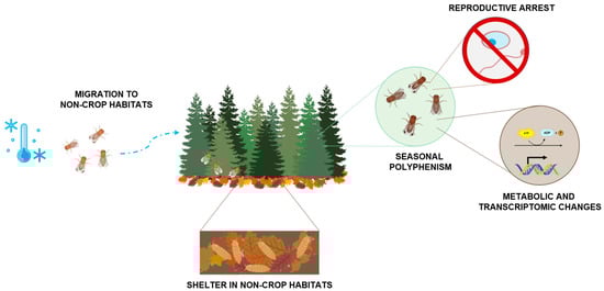Drosophila suzukii overwintering strategies. When the temperature starts to drop, adult flies take shelter in non-crop habitats, using non-crop hosts as food and reproduction sources; immature stages such as pupae often take shelter in leaf litter. The adults that are capable of emerging after cold exposure have developed seasonal polyphenism, being larger and darker (winter morphotypes), as well as exhibiting reproductive arrest and changes at the metabolic and transcriptomic levels.