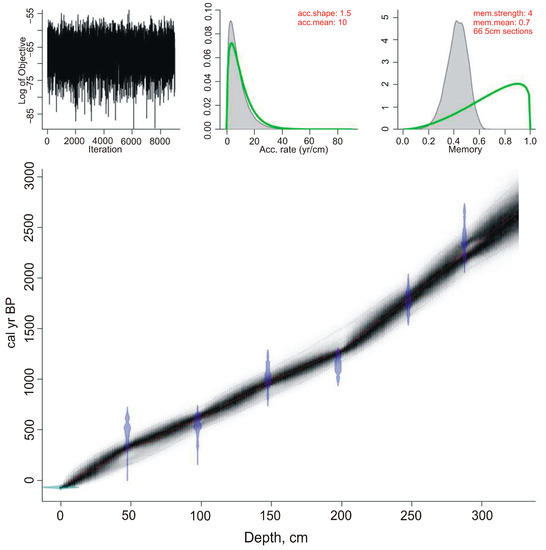 38]. The calibrated age was determined by the age-depth model constructed using Bacon 2 [