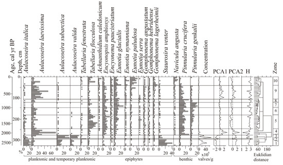 35]. The content of diatom valves in 1 g of air-dry sediment was calculated to determine the productivity of diatom flora depending on the ecological state of the lake at different stages of its development. The main taxa were indicative of changes in environments, which are shown in the percentage diagram (abundance ≥ 5%). The diatom record was divided into assemblages based on cluster analysis. Principal Component Analysis (PCA) was used as additional proof of zonation. Cluster analysis and PCA was performed using PAST 3.26 software [