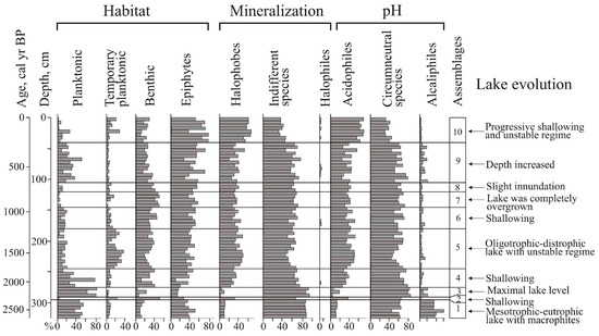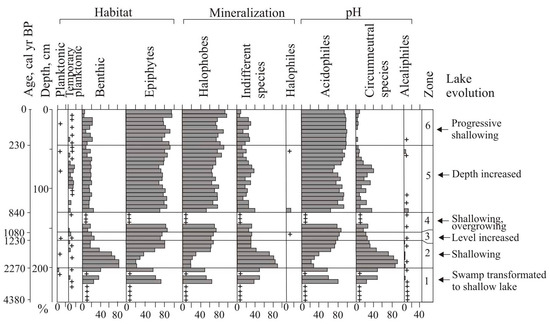 Figure 6). Testate amoebae, typical of heavily watered environments, including sphagnophiles, developed in abundance ~1870 cal yr BP. A sharp change in diatom taxonomic composition indicates significant transformations in the lake ecosystem.