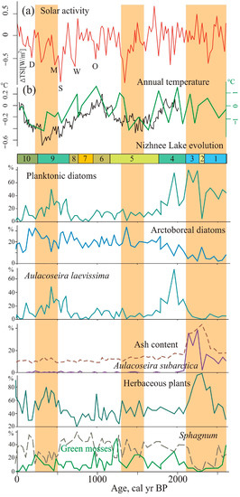 The maximum lake level of the Nizhnee Lake was ~2280–2110 cal yr BP, which coincides with slight warming connected with increased solar activity [
