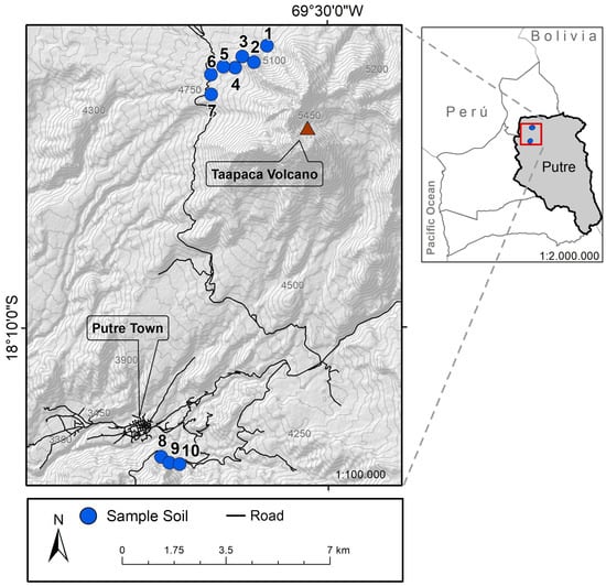 Putre and Taapaca volcano map. Sampling sites are indicated as enumerated blue points on the map.