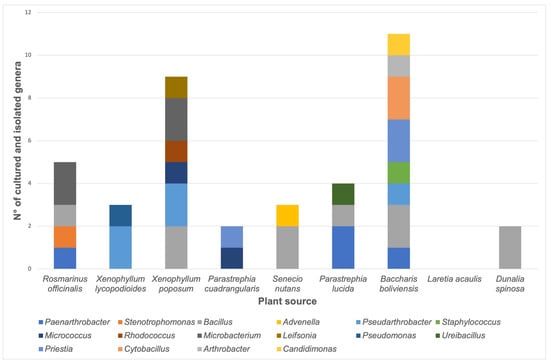 Number of stable bacterial cultures according to the plant source. The quantity of each genus is represented as a color bar, as indicated in the image.