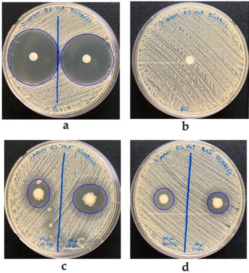 Agar diffusion antibacterial activity of K64 strain against Staphylococcus aureus ATCC 25923. (a) Inhibition halo using Kanamycin as a positive control. (b) PBS on filter paper as negative control (IZD of 162 mm). (c) Inhibition halo with 20 μL of K64 strain grown in TSB (left, IZD of 16.2 mm) and BHI (right, IZD of 21.3 mm). (d) Inhibition halo with supernatant of K64 growing in TSB (weak IZD of 15 mm) or BHI (IZD of 15.8 mm), respectively.