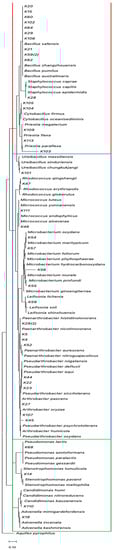 The phylogenetic tree is based on the 16S rDNA gene sequences of the isolated bacteria and their closely related species obtained from GenBank. The tree was constructed using the maximum likelihood method. The presence of Actinomycetota, Pseudomonadota, and Bacillota phyla are indicated as blue, green, and red boxes, respectively. The accession number of each retrieved sequence is indicated in Table S2.