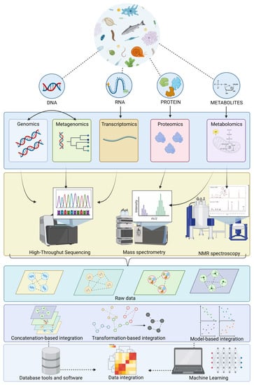 For this reason, categorized data integration through a meta-dimensional analysis has three approaches: concatenation-based integration, which combines multiple data matrices for each sample into a large input matrix before constructing the model; transformation-based integration, which combines various datasets after transforming each data type into an intermediate form, such as graphs or kernel matrices; finally, these are merged into multiple graphs to generate the model and produce model-based integration, based on generating multiple models using the different data types as training sets and then generating a final model from the multiple models created during the training phase. Machine learning analysis has become increasingly popular in biological sciences, including processing complex omics data and their integration. This method aims to acquire and learn from historical or current data to make predictions or select measures for future data. Machine learning algorithms have different attributes, so it is crucial to choose an appropriate algorithm for analysis, which is explained in detail in the work by [204]. In this sense, it is of utmost importance to establish an integrated platform that ensures the correct analysis of data obtained from these omics techniques. This allows for easy study of interactions between different omics. However, a multidisciplinary platform for the multi-omics analysis of aquatic ecosystems has not yet been achieved. Currently, there are analysis packages in R that provide semi-supervised methodologies such as mixOmics. This software allows for interaction and association between datasets, providing a unique data matrix. Additionally, a package called MiBiOmics has been implemented, allowing for the parallel study of up to three omics datasets and deep exploration and integration of each dataset, which is not provided by mixOmics [106]. As a synoptical view, Figure 1 illustrates omics data and informatics tools for each omics and multi-omics approach and system of data processing.