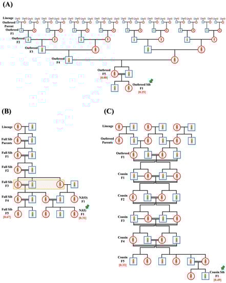 Initially, multiple replicates of three major crosses were set in a single-pair confirmation, namely, outbred (n = 218) or full-sibling (n = 251) from lineages and cousin (n = 206) from outbred F1 progeny. The crosses were continued until F5 progeny to attain the final inbreeding coefficient (f) of 0.00 (outbred F5 progeny), 0.67 (full-sibling F5 progeny) and 0.33 (cousin F5 progeny) (Figure 1A–C). From the F1 to F5 generation, outbred crosses were set in a manner such that mating pairs never shared a common lineage (Figure 1A). From the F1 to F5 generation, all cousin crosses were planned to ensure that the mating pair would always be first cousins (Figure 1C). Multiple replicates of F5 progeny of outbred (n = 288) and cousin (n = 203) crosses were subjected to full-sibling crosses in a single-pair confirmation to attain F1 progeny with f = 0.25 (outbred sibling) and f = 0.49 (cousin sibling), indicated by green arrows in Figure 1A and C. In addition, F3 progeny of full-sibling crosses were set to mate with outbred F3 progeny of the opposite sex of different lineages in a pair confirmation. Resulting F1 progeny (NJ(O)) were mated with F4 progeny of full-sibling crosses in multiple replicates (n = 81), sharing ¾ common grandparents to attain new F1 progeny (NJ(I)) with f = 0.31, as highlighted by the green arrow in Figure 1B.