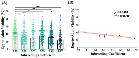 Effect of inbreeding on egg-to-adult viability. (A) Bar graph represents drop in egg-to-adult viability of inbred progeny (f > 0.00) flies compared to outbred flies (f = 0.00). The height of the bars represents the mean egg-to-adult viability, where error bars show standard error of mean. (B) Graph showing strong negative correlation between egg-to-adult viability and inbreeding coefficient. The solid and dotted lines represent the trend of the data and 95% confidence interval band, respectively. (** p ≤ 0.01, **** p < 0.0001; Kruskal–Wallis, Dunn’s Test.) For the total number of data points, kindly see Supplementary File S3.