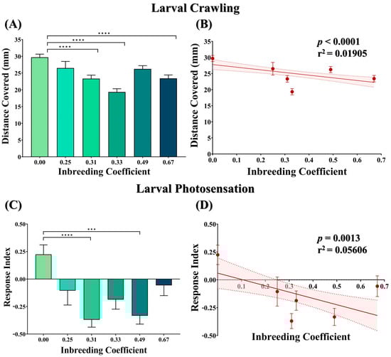 Effect of inbreeding on larval locomotory and phototaxis. (A) Bar graph showing comparison between the distance covered by the larvae of different inbreeding coefficients. (B) Graph showing correlation between distance covered and inbreeding coefficient. Graphs showing (C) comparison of phototaxis response index and (D) correlation between inbreeding coefficient and phototaxis response index. Here, the height of the bars represents the mean values, and error bars show standard error of mean. The solid and dotted lines represent the trend of the data and 95% confidence interval band, respectively. (*** p ≤ 0.001, **** p ≤ 0.0001; Kruskal–Wallis, Dunn’s Test.) For the total number of data points, kindly see Supplementary File S3.