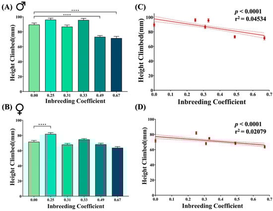 Effect of inbreeding on negative geotaxis. Bar graphs showing difference in the height climbed by (A) male and (B) female flies of different inbreeding coefficients. Graphs showing correlation between inbreeding coefficient and height climbed by both (C) male and (D) female flies. The height of the bars represents the mean height climbed by flies, where error bars show standard error of mean. Solid and dotted lines represent trend of the data and 95% confidence interval band (**** p ≤ 0.0001; Kruskal–Wallis, Dunn’s Test). For the total number of data points, kindly see Supplementary File S3.