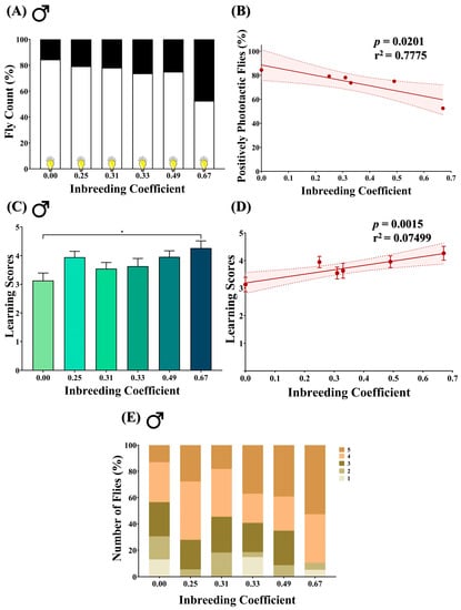 Effect of inbreeding on phototactic behavior and learning ability in flies. (A) Stacked bar graph representing the percentage of positive and negative phototactic flies with different inbreeding coefficients. (B) Graph showing correlation between the percentage of positively phototactic flies and inbreeding coefficient. (C) Bar graph representing comparison between the learning scores of positively phototactic flies of different inbreeding coefficients. (D) Linear regression graph showing the positive correlation between learning scores and inbreeding coefficient. (E) Stacked bar graph showing the distribution of male flies with different inbreeding coefficients according to the learning scores, where 1 is the lowest and 5 is the highest. The height of the bars represents the mean values, where error bars show standard error of mean. Solid and dotted lines represent trend of the data and 95% confidence interval band, respectively (* p < 0.05; Kruskal–Wallis, Dunn’s Test). For the total number of data points, kindly see Supplementary File S3.