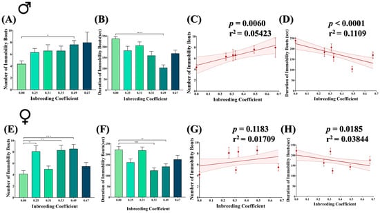 The forced-swim assay was conducted to evaluate the escape response of both male and female flies under stress conditions. The flies were examined for the number and duration of immobility bouts, where physical immobility represents behavioral despair in flies. In general, both male and female inbred flies showed a better escape response compared to outbred flies. For example, the number of immobility bouts was increased by nearly twofold in male inbred flies (f = 0.49) compared to outbred flies (Figure 6A), with a significant decrease in the duration of immobility bouts (Figure 6B). Consistently, in male flies, an increased inbreeding coefficient showed an increase in the number of immobility bouts (Figure 6C) but a decrease in the duration of immobility bouts (Figure 6D). This collectively represents a longer duration of mobility in the inbred flies than the in outbred flies under stress conditions. Although female inbred flies also showed an increase in the number of immobility bouts (Figure 6E) and a decrease in the duration of immobility (Figure 6F), the overall effect is less pronounced compared to male inbred flies (Figure 6G,H).