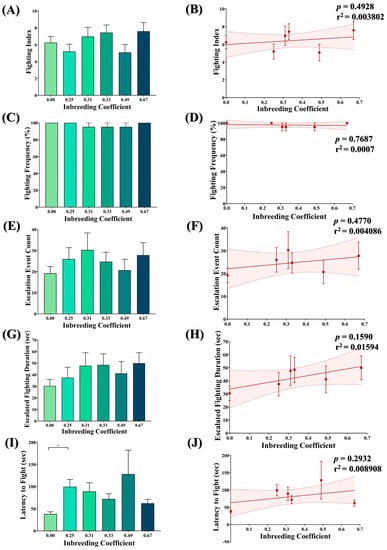 Effect of inbreeding on aggression. Graphs showing comparison and correlation of (A,B) fighting index, (C,D) fighting frequency, (E,F) count of escalated fighting event, (G,H) duration of escalated fighting and (I,J) latency to fight, respectively, with reference to inbreeding coefficient. The height of the bar represents the mean value for observed data, where error bars show standard error of mean. The solid and dotted lines represent the trend of the data and 95% confidence interval bands, respectively. (* p < 0.05; Kruskal–Wallis, Dunn’s Test.) For the total number of data points, kindly see Supplementary File S3.