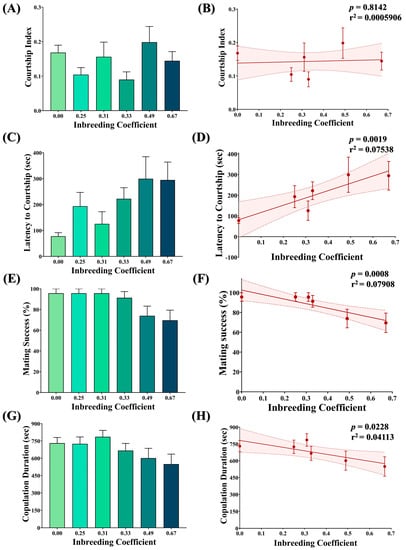 No statistically significant difference was observed in the courtship index of flies with different inbreeding coefficients (Figure 8A). Consistently, no association was observed between the inbreeding coefficient and the courtship index (Figure 8B). Nevertheless, an increase in the latency to courtship (Figure 8C,D), a drop in mating success (Figure 8E,F) and a drop in copulation duration (Figure 8G,H) were observed with an increased inbreeding coefficient.