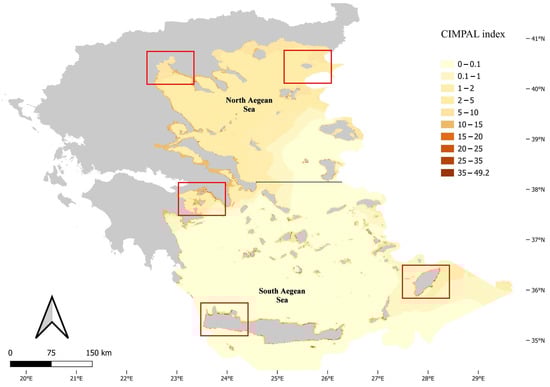 Map of ICAS cumulative impacts in the Aegean Sea, according to the CIMPAL index scores. Red rectangles highlight selected areas depicted in Figure 2.