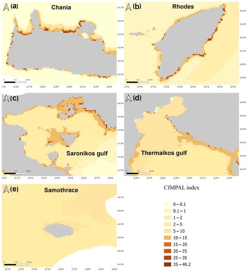 Examples depicting the variation in CIMPAL scores in the Aegean Sea. Notably the South Aegean areas (a–c) display a higher frequency of high CIMPAL scores compared to the North Aegean areas (d,e).