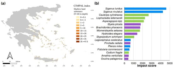 (a) Estimation of the CIMPAL index for shallow hard substrates (0–60 m) in the Aegean Sea. (b) ICAS in this habitat type, ranked by the estimated total impact score per species (summed over all grid cells). Green color for macrophytes, blue for fish and purple for invertebrates.