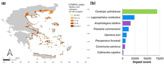 (a) Estimation of the CIMPAL index for shallow soft substrates between 0 and 60 m depth in the Aegean Sea. (b) ICAS in this habitat type, ranked by the estimated total impact score per species (summed over all grid cells). Green color for macrophytes, blue for fish and purple for invertebrates.
