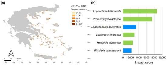 (a) Estimation of the CIMPAL index for seagrass meadows in the Aegean Sea. (b) ICAS in this habitat type, ranked by the estimated total impact score per species (summed over all grid cells). Green color for macrophytes, blue for fish and purple for invertebrates.