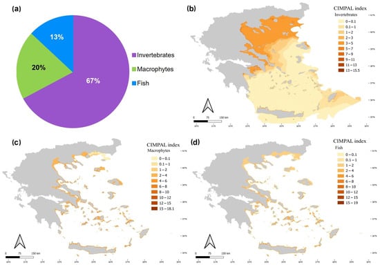(a) Disaggregation of the total CIMPAL score by biotic group (invertebrates: purple color, macrophytes: green, fish: blue), and maps of ICAS impacts in the Aegean Sea for (b) invertebrates, (c) macrophytes, and (d) fish.