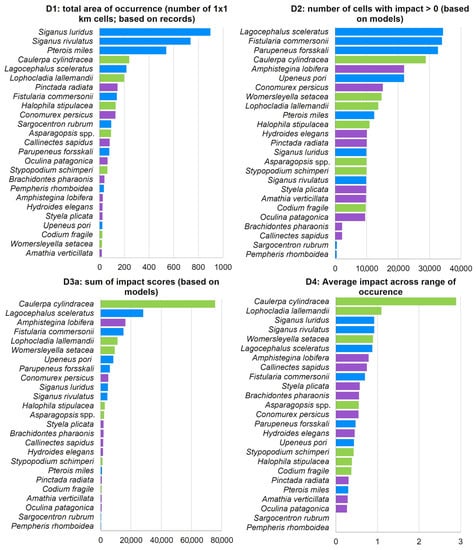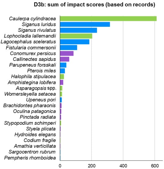 Moreover, indicator D3 was also estimated based on actual ICAS records—D3b—(Figure 9) instead of their modelled distribution—D3a—(Figure 8). D3b ranked six fish, two macrophytes, and two invertebrates in its top 10. Although both methods had seven species in common in their top 10, there were some differences in the rankings. For instance, the two invasive siganids ranked 10th and 11th in D3a but ranked 2nd and 3rd in D3b. The invasive foraminiferan A. lobifera ranked 3rd in D3a and 12th in D3b. The lionfish P. miles ranked 19th in D3a and 10th in D3b (Figure 8 and Figure 9).