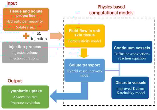 In this paper, an approximate continuum poroelastic model is developed to simulate the pressure evolution in the soft subcutaneous tissue. The pressure evolution of the proposed model is quantitatively validated against the analytical solution and the numerical solution of the poroelasticity model. The effect of elasticity, variable porosity and permeability on pressure build-up is numerically investigated. The convective and diffusive transport of drug solute into the lymphatic vessels is investigated through an improved Kedem–Katchalsky model by implementing the hybrid vessel network in the continuum poroelastic model. At last, heterogeneous vessel networks with various structures are used to investigate the effect of the morphology of the lymphatics on solute transport into the lymphatic system in the multi-layer soft skin tissue.