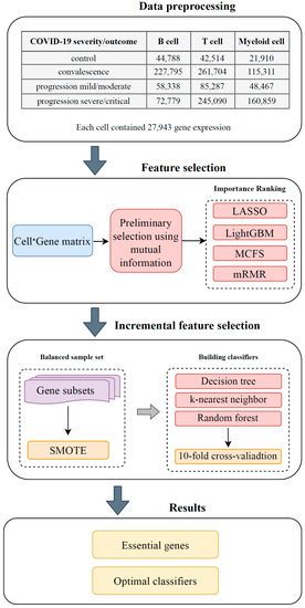Figure 1 illustrates the workflow designed for this study. Three types of immune cell samples were grouped according to COVID-19 severity/outcome. Each cell sample represented many gene features. These features were initially filtered by their relevance to the target variable (Section 2.2), and the remaining features were analyzed by four ranking algorithms (Section 2.3). Four ranked lists were output based on the features’ importance. Each list was then fed into the incremental feature selection (IFS) framework [11] (Section 2.4). Several classifiers were constructed based on three classification algorithms (Section 2.6) in the IFS procedure. When constructing classifiers, the synthetic minority oversampling technique (SMOTE) [10] (Section 2.5) was employed to tackle the imbalanced problem of the datasets. The final key genes and high-performance classifiers associated with the target variables were obtained.