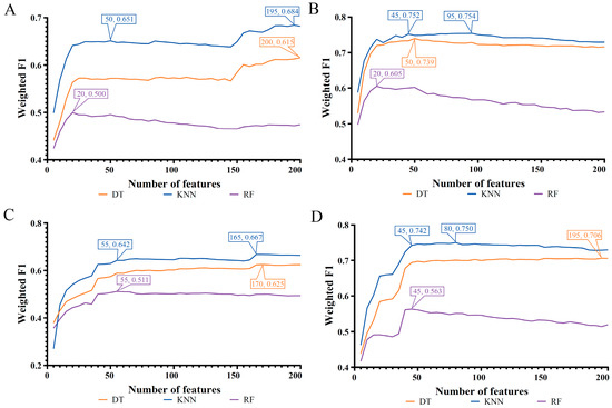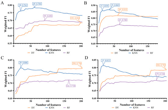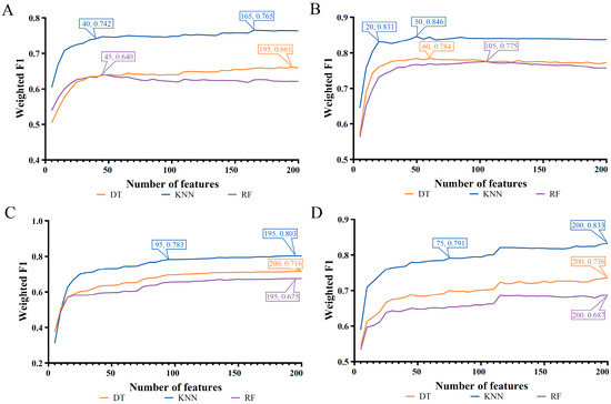 Figure 4 shows the IFS curves for myeloid cells. The same results could be observed for the other two cell types. The optimal KNN classifier provided higher weighted F1 than other two optimal classifiers on the same feature list. Furthermore, the optimal classifier also yielded better ACC, MCC, and Macro F1 values than the other two optimal classifiers on the same feature list, which can be concluded from Table 4. Thus, KNN was more suitable to classify myeloid cells than DT and RF.