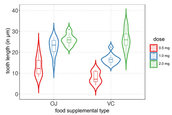 - Vitamin C dose (): This covariate is measured in milligrams (mg) and has three levels: 0.5 mg, 1.0 mg, and 2.0 mg. The vitamin C dose variable is ordinal.