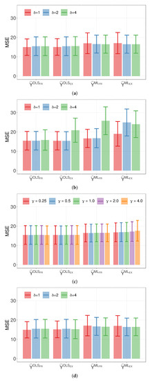 Plots of average MSE of the indicated response prediction and parameter (with error bars) for: (a) model M1 and binary distance; (b) Model M1 and Euclidean distance; (c) Model M1 and Minkowski distance; and (d) model M2 and Euclidean distance.