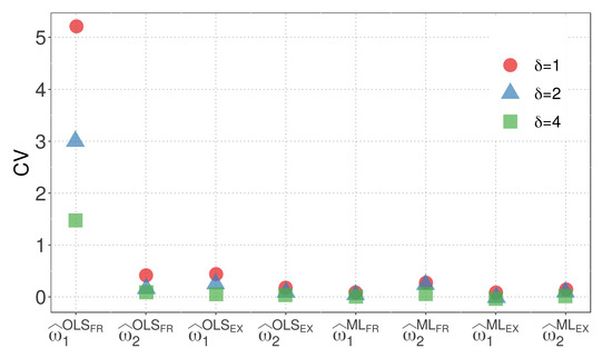 By considering the results from both models, we can compare the variability of the parameter estimates for M1 and M2 with the regression model. Model M2, which has the same number of parameters as the regression model, allows for a more straightforward visual comparison. In terms of the EX similarity, except for the case where , where the estimate of the weight has high variability, the estimates for model M2 exhibit competitive variability with the regression model in other cases. Figure 6 and Figure 7 present a visualization of the CVs of the parameter estimates for model M2 and the regression model using the ML method, respectively. The figures highlight the variability of the estimates and show the competitive performance of model M2, with the EX similarity yielding consistent results except for the case where .